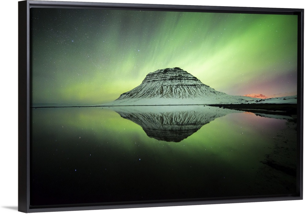 <p>Aurora Borealis lighting up the sky in green and pink over a mountain in Iceland.</p>