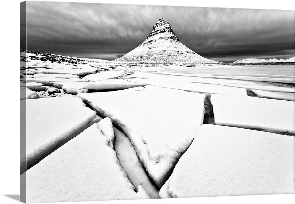 <p>Kirkjufell (Church Mountain) in winter with broken lake ice, near Grundafjordur, Snaefellsnes Peninsula, Iceland.</p>