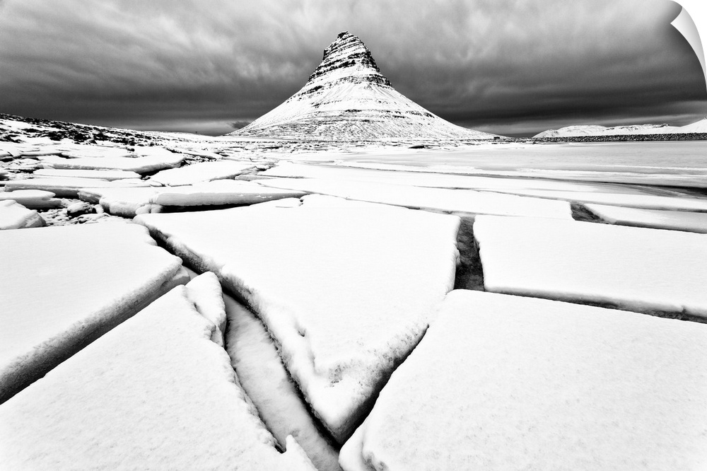 <p>Kirkjufell (Church Mountain) in winter with broken lake ice, near Grundafjordur, Snaefellsnes Peninsula, Iceland.</p>