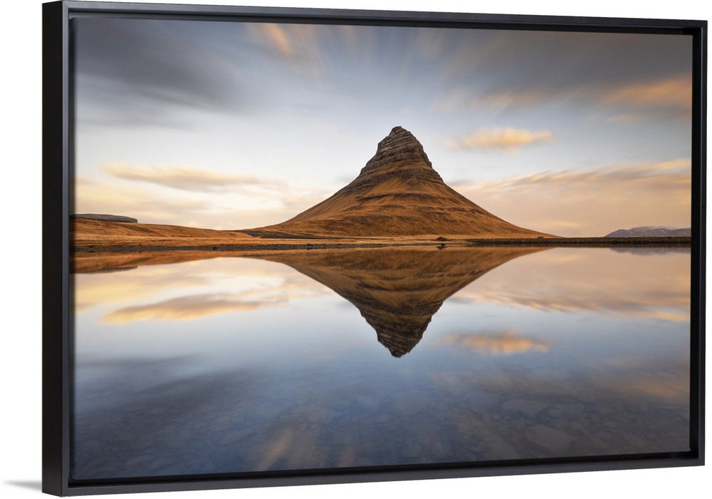<p>Kirkjufell mount reflected in a little lagoon during a winter sunrise, Snaefells Peninsula, Vesturland, Iceland</p>