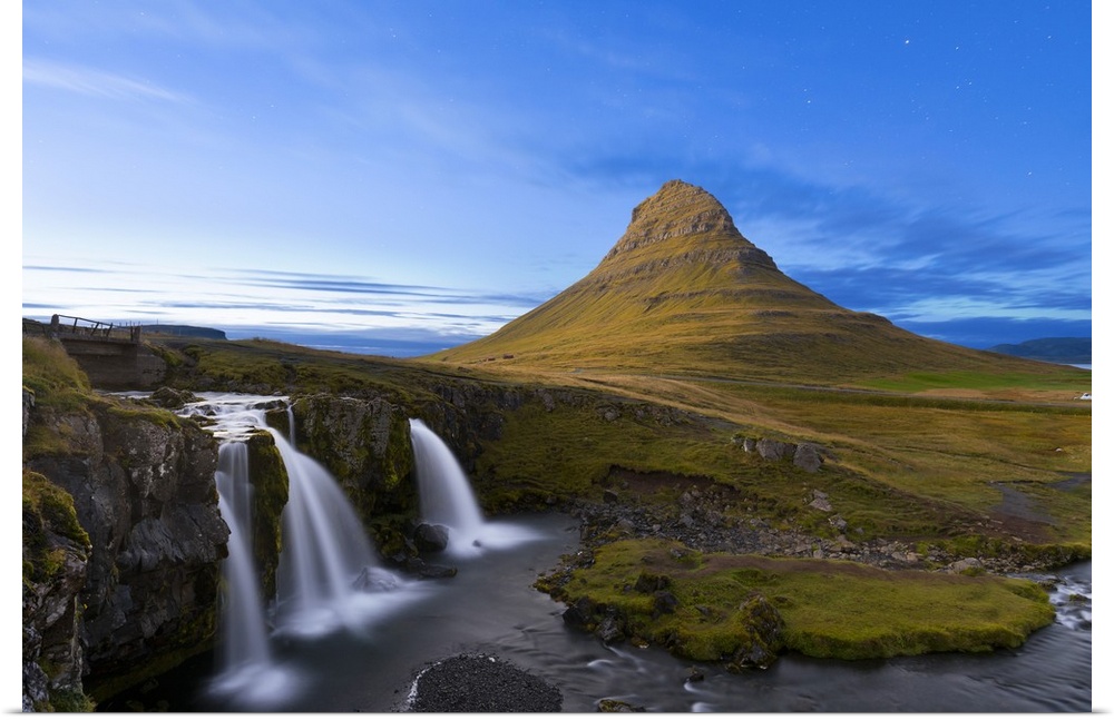 <p>Kirkjufell Mountain and Kirkjufoss Waterfall at dusk, Snaefellsnes Peninsula, Iceland, Polar Regions</p>