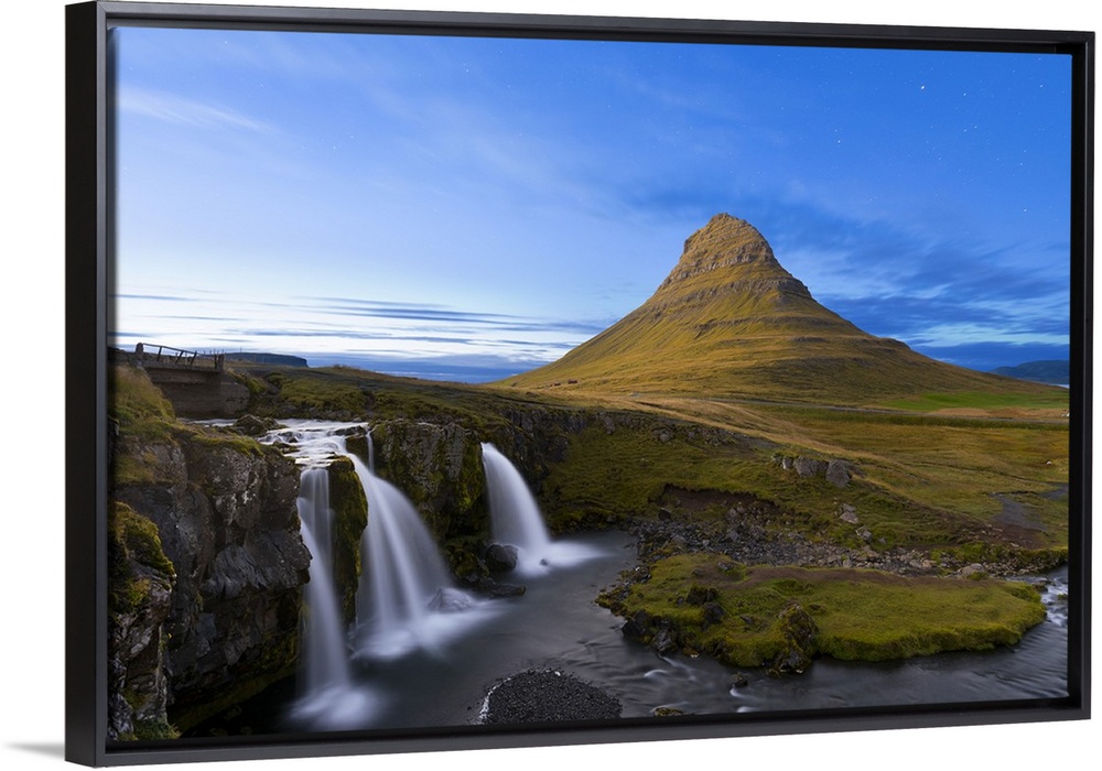 <p>Kirkjufell Mountain and Kirkjufoss Waterfall at dusk, Snaefellsnes Peninsula, Iceland, Polar Regions</p>