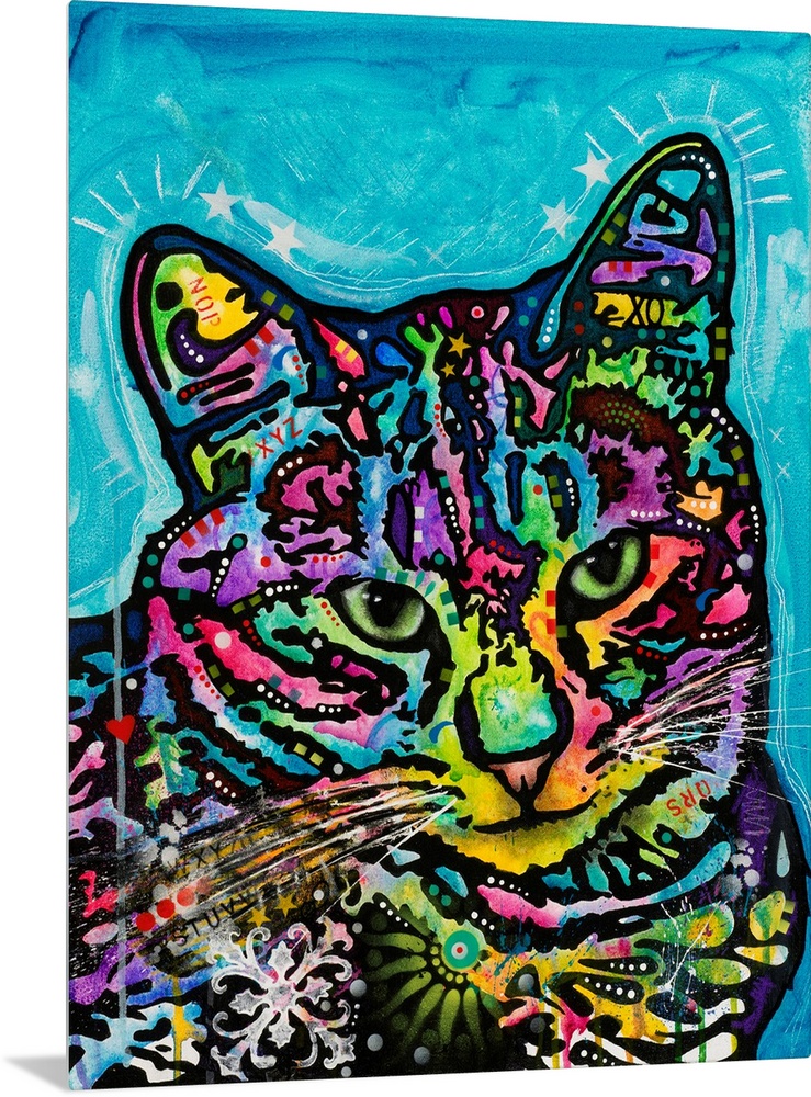 <p>Colorful painting of a cat named Kismet covered in abstract markings on a blue background.</p>