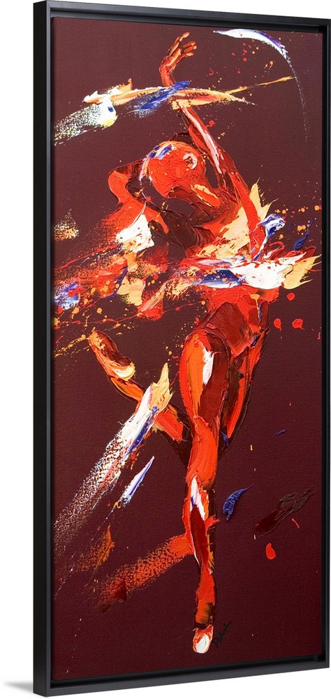 <p>Contemporary painting using deep warm colors to create a woman dancing against a dark red background.</p>