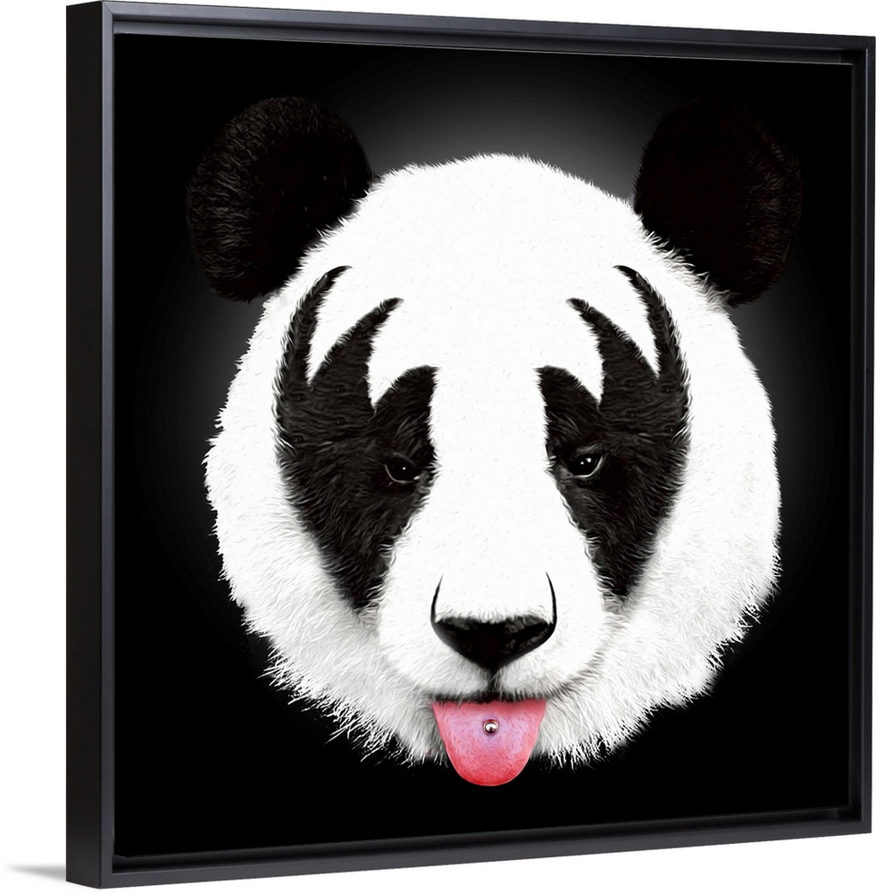 <p>Contemporary portrait of a panda bear with make-up around its eyes and sticking its tongue out.</p>