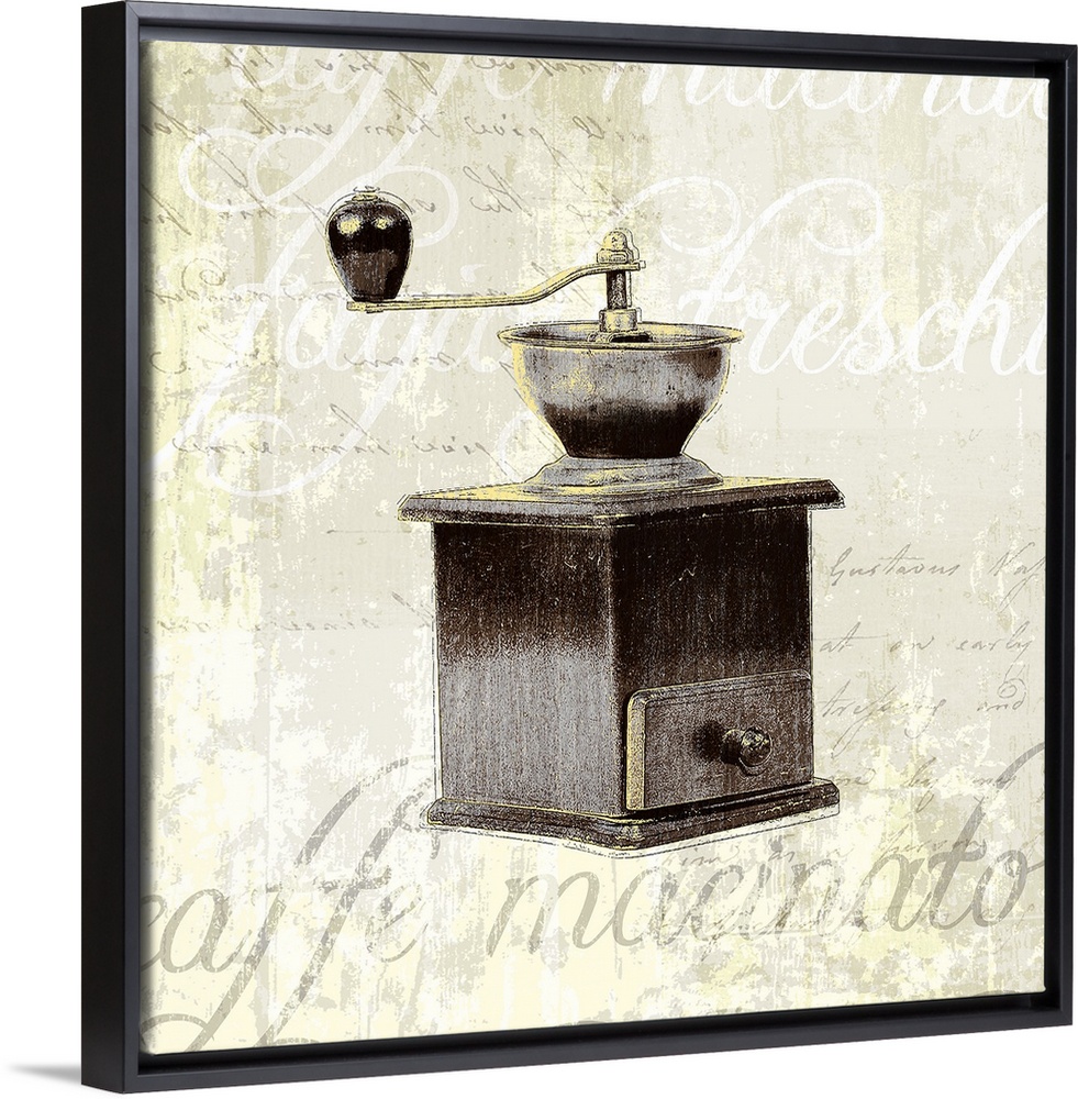 <p>Decorative artwork of a vintage coffee grinder on a beige backdrop that has distressed text in white and gray.</p>