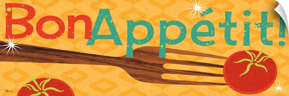 <p>Artwork perfect for the kitchen of a large wooden spoon that has a tomato on the end of it and the text written above "Bon Appetit".</p>
