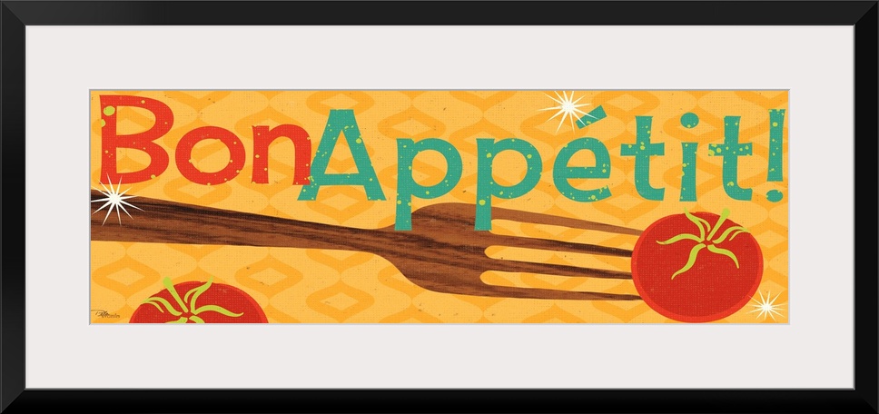 <p>Artwork perfect for the kitchen of a large wooden spoon that has a tomato on the end of it and the text written above "Bon Appetit".</p>