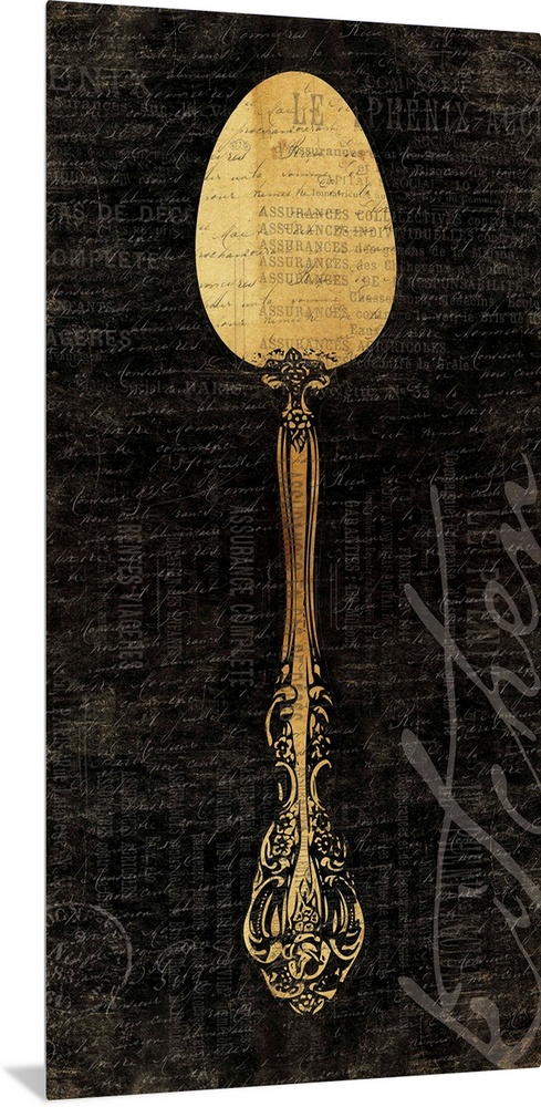 <p>artwork of decorative antique kitchen spoon against dark textured background.</p>