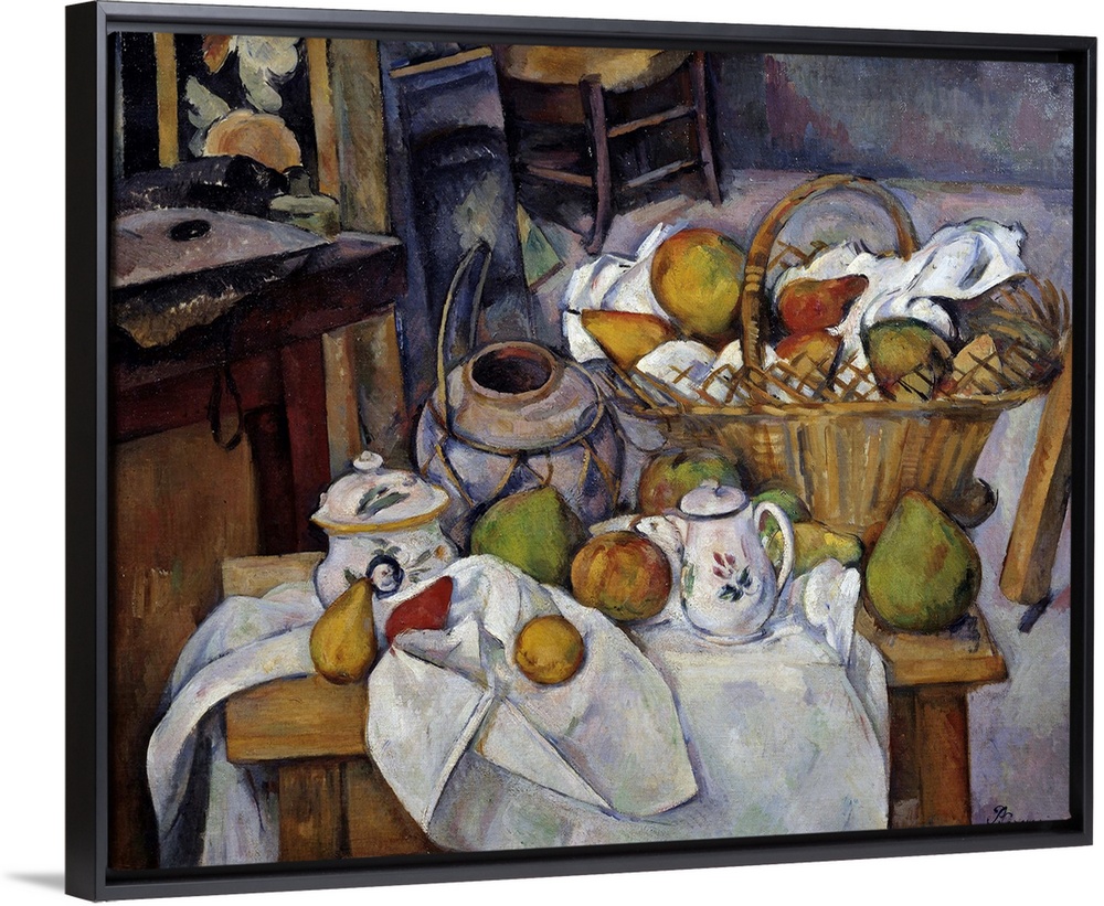 <p>Kitchen table or Still-life with Basket. Objects and fruits assembled on a table. Painting by Paul Cezanne (1839-1906) 1888. Orsay Museum, Paris</p>