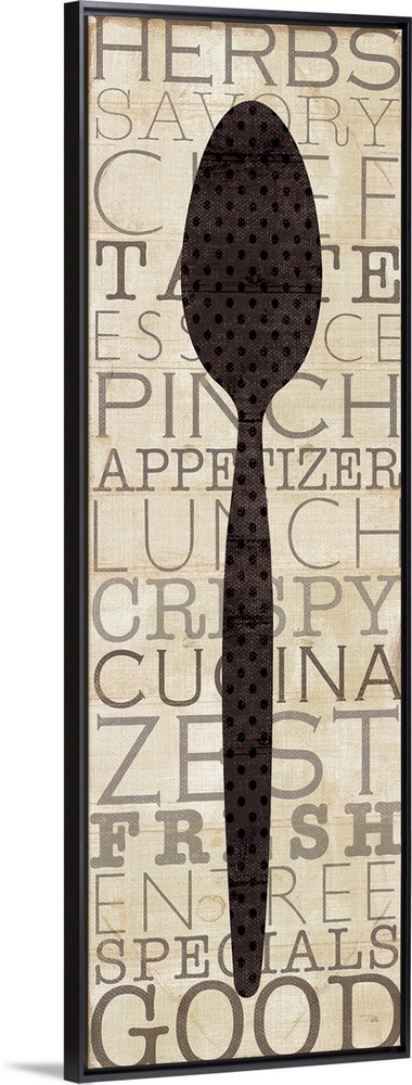 <p>Abstract painting on a vertical canvas of a spoon over top of various text in the background.</p>