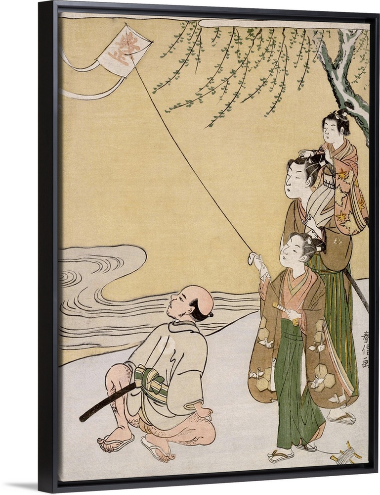 <p>Illustration of a boy playing with a kite accompanied by his family made by Japanese artist Suzuki Harunobu during the Edo period (1766).</p>