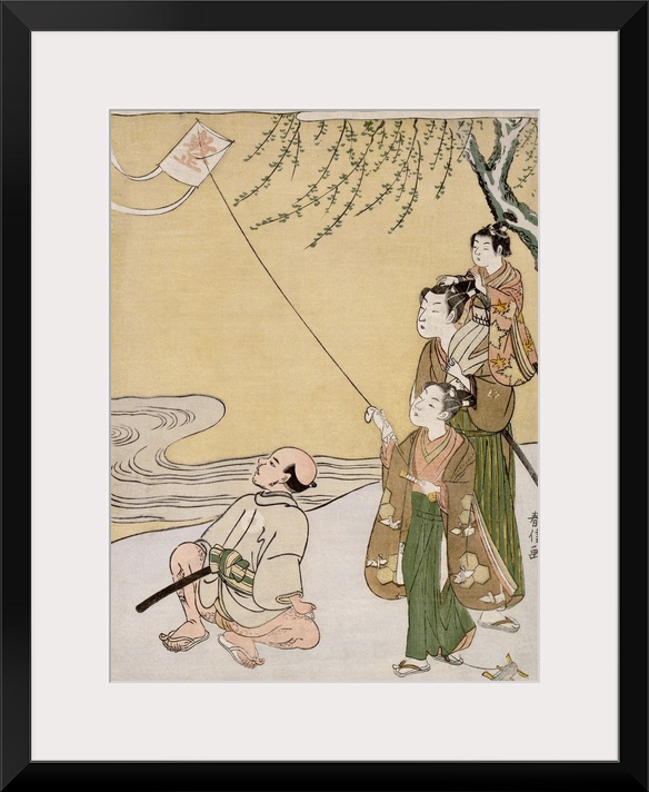 <p>Illustration of a boy playing with a kite accompanied by his family made by Japanese artist Suzuki Harunobu during the Edo period (1766).</p>