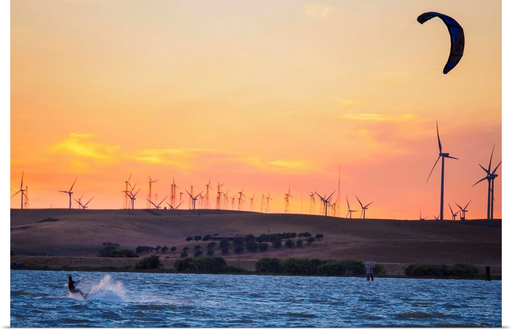 <p>North America, United States, California, Rio Vista, Sacramento River Delta. Kiteboarder at sunset with wind farm turbines in background.</p>