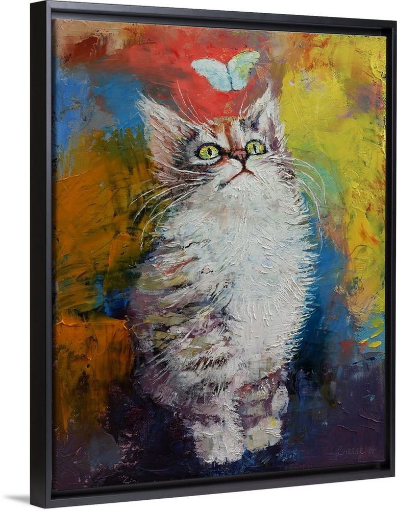 <p>A contemporary painting of a kitten looking up at a little butterfly.</p>