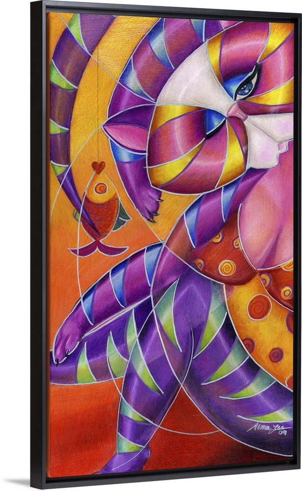 <p>Vertical contemporary artwork in the style of cubism of a cat with a fish in bold colors.</p>