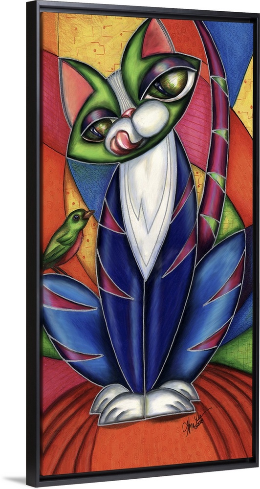<p>Contemporary artwork in the style of cubism of a cat with a bird perched on her leg.</p>