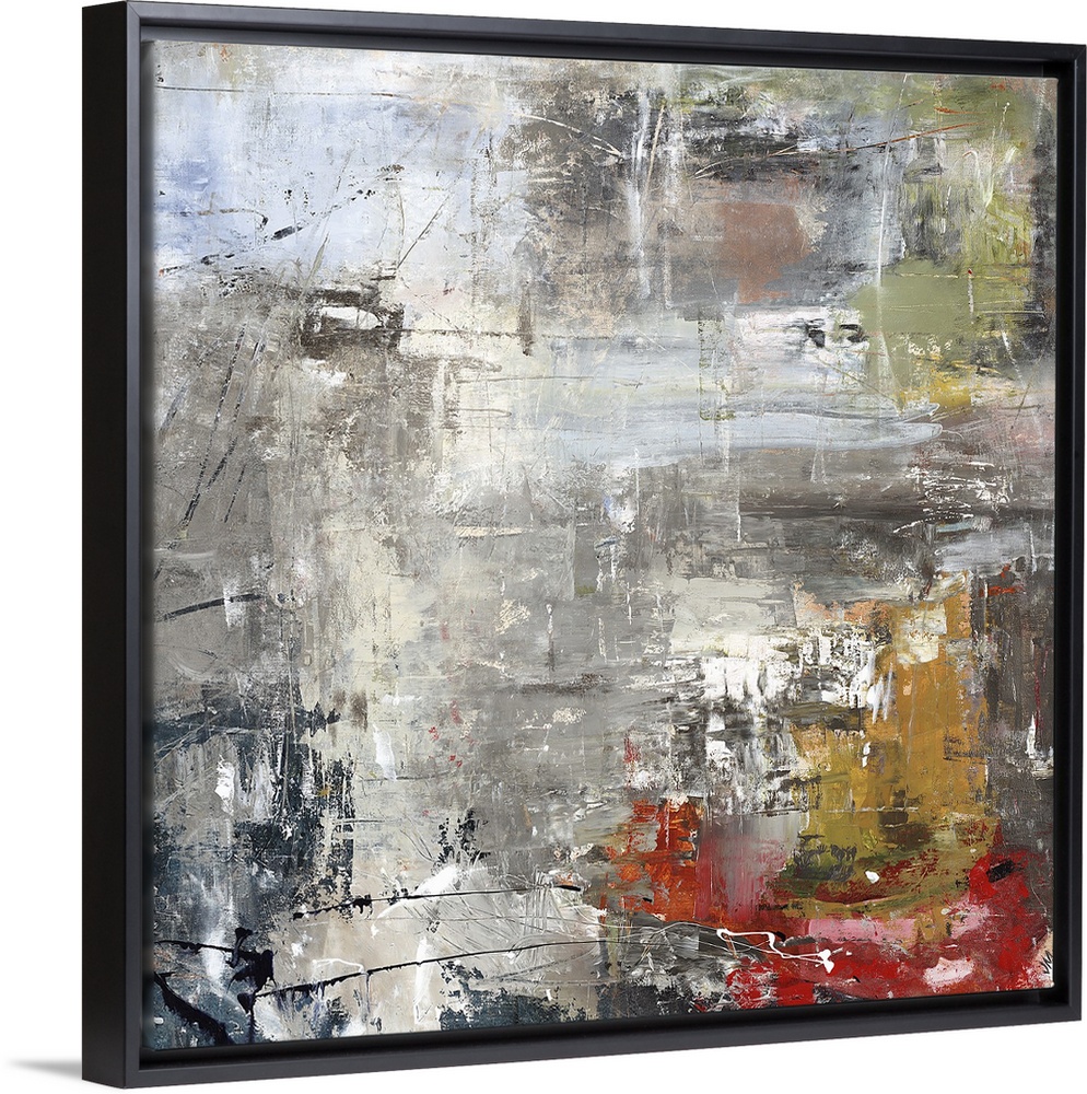 <p>Square abstract painting of textured natural colors such as gray, brown and red.</p>