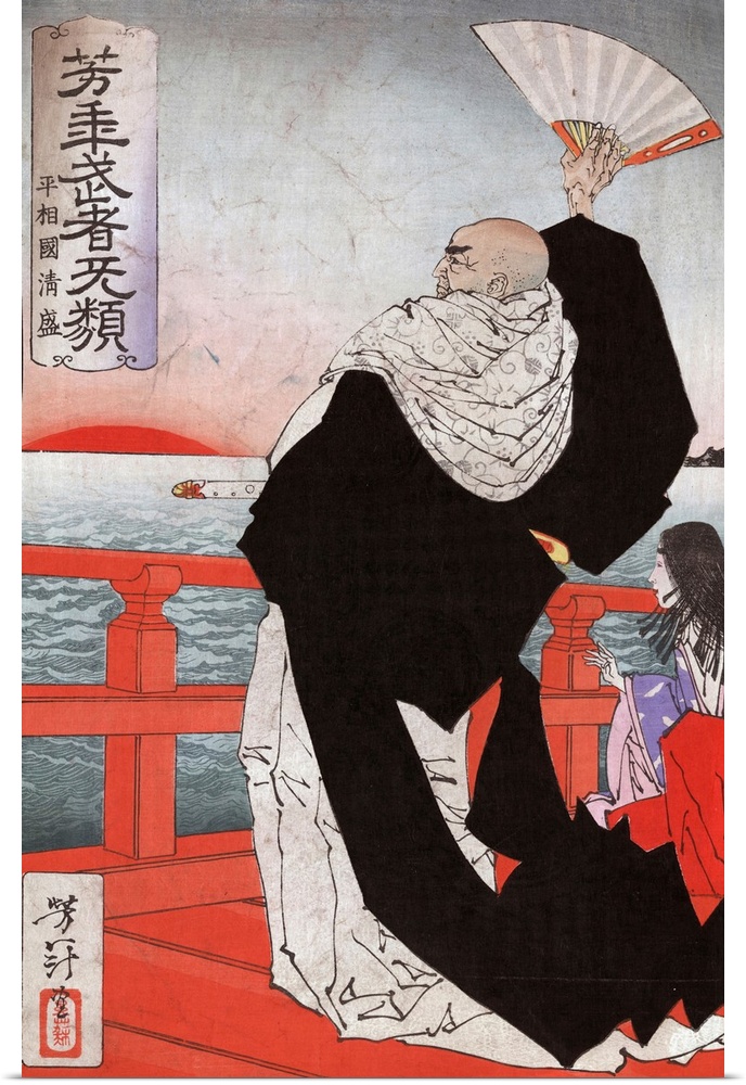 <p>Colour, woodcut print showing Kiyomori Heishokoku, full length portrait, standing, facing left, holding a fan in raised right hand, looking across the sea at a rising or setting sun, with a young woman standing on the right, by Yoshitoshi Taiso.</p>
