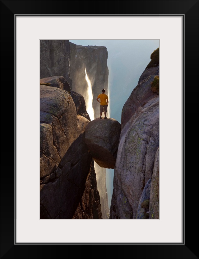 <p>A lone tourist takes in the breathtaking vistas from the Kjerag bolt, one of Norways premier tourist attractions, Kjerag Plateau, Light Fjord, Norway, MR</p>