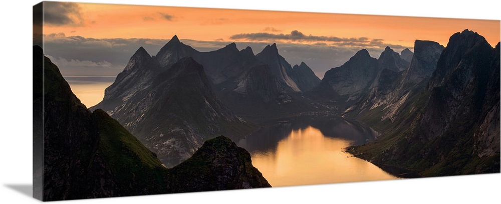 <p>Kjerkfjorden among dramatic mountain ridges at sunset, Lofoten, Nordland, Norway.</p>