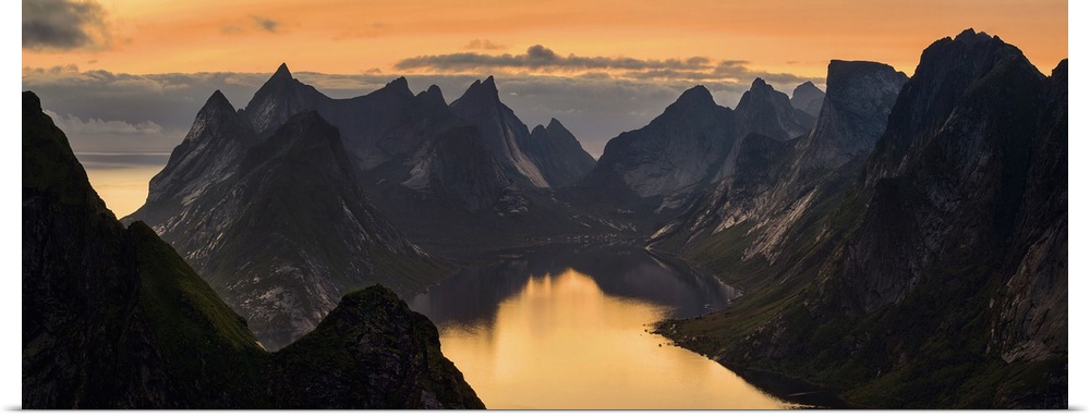 <p>Kjerkfjorden among dramatic mountain ridges in sunset light, Lofoten, Norway</p>