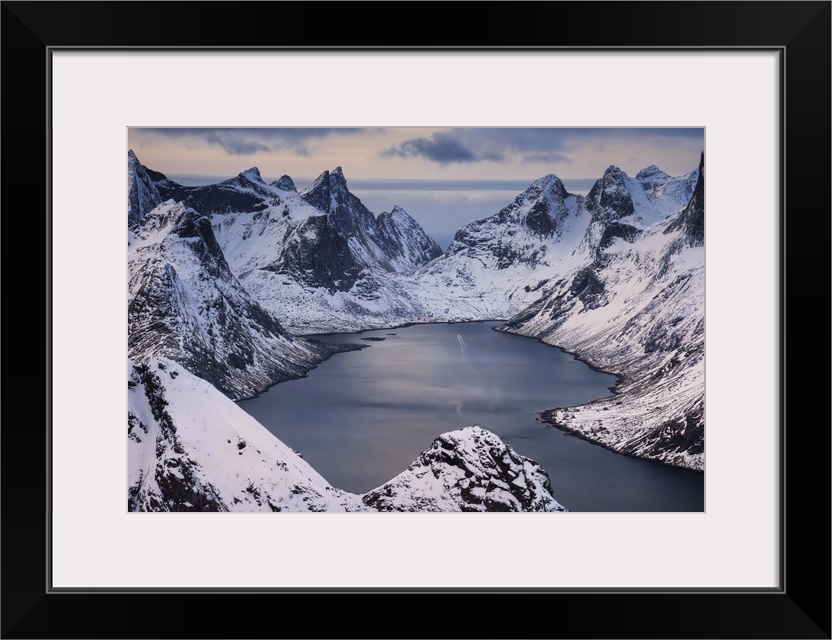 <p>Kjerkfjorden among dramatic snowy mountain ridges in sunset light, Lofoten, Norway</p>