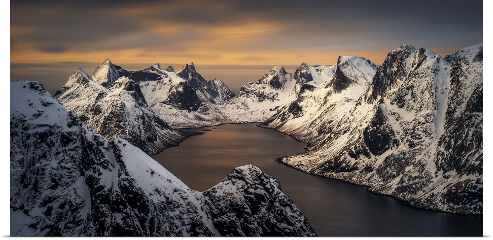 <p>Kjerkfjorden among dramatic snowy mountain ridges in sunset light, Lofoten, Norway</p>