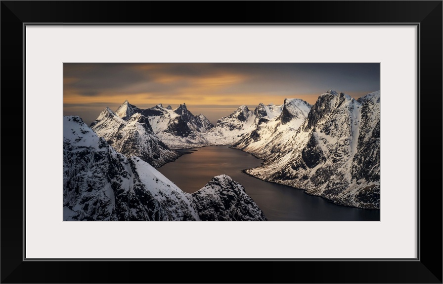 <p>Kjerkfjorden among dramatic snowy mountain ridges in sunset light, Lofoten, Norway</p>