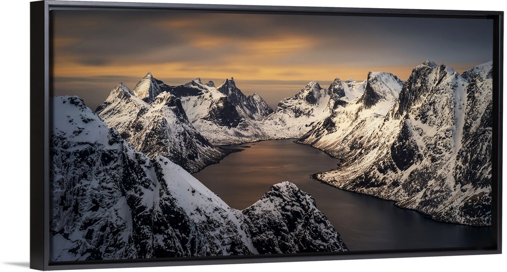 <p>Kjerkfjorden among dramatic snowy mountain ridges in sunset light, Lofoten, Norway</p>