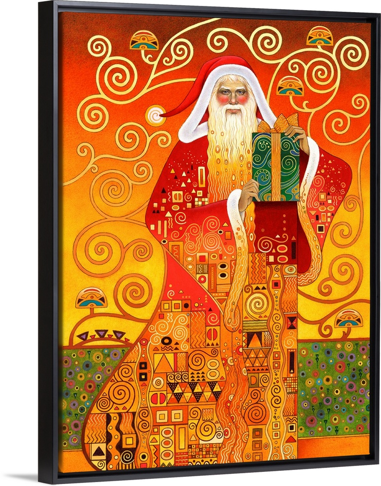 <p>A contemporary painting of Santa Claus holding a gift done in Gustav Klimt's signature style.</p>