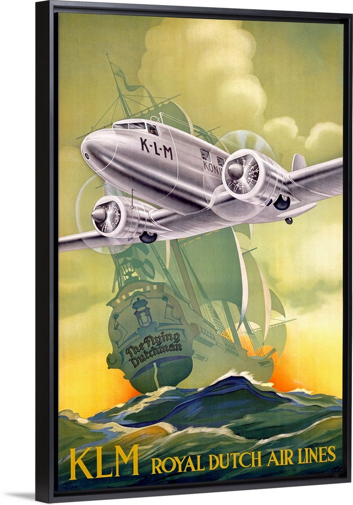 <p>Large antique art portrays an advertisement for a company offering airplane transportation. In the advertisement, a big twin-engine aircraft can be seen in front of a giant sailing ship, while text for the advertisement is located at the bottom of the canvas art.</p>