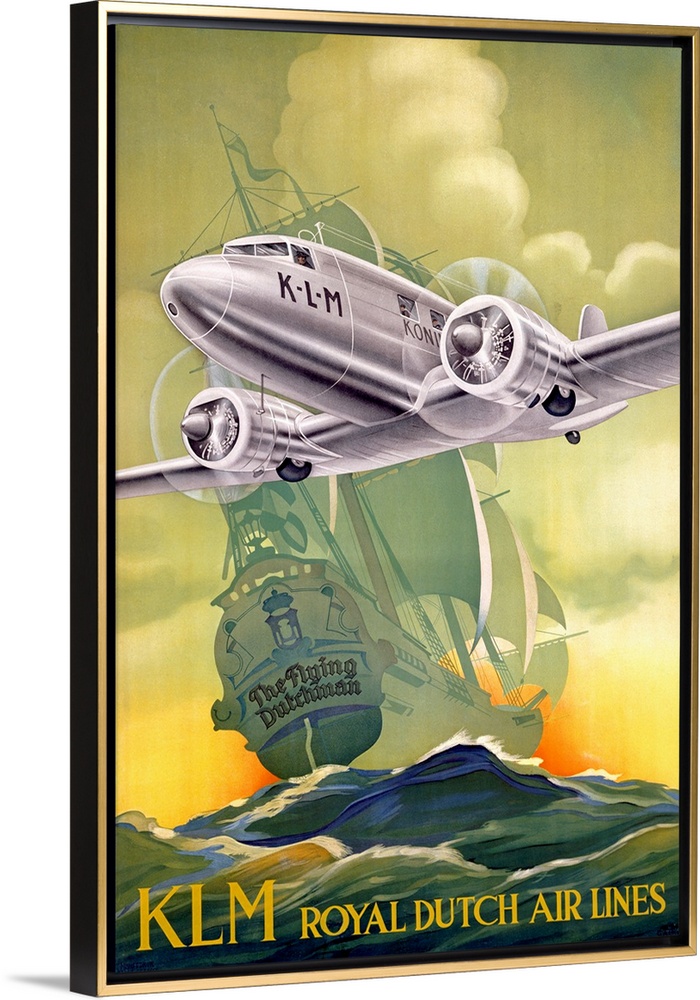 <p>Large antique art portrays an advertisement for a company offering airplane transportation. In the advertisement, a big twin-engine aircraft can be seen in front of a giant sailing ship, while text for the advertisement is located at the bottom of the canvas art.</p>