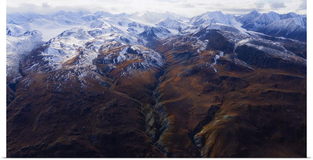 <p>Aerial photo of Kluane national park with fall colors and snow-capped peaks as autumn fades into winter creating a breathtaking image to fest upon; Haines junction, Yukon, Canada.</p>