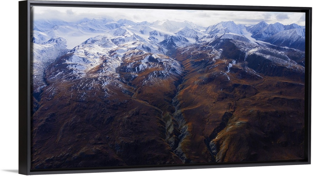 <p>Aerial photo of Kluane national park with fall colors and snow-capped peaks as autumn fades into winter creating a breathtaking image to fest upon; Haines junction, Yukon, Canada.</p>
