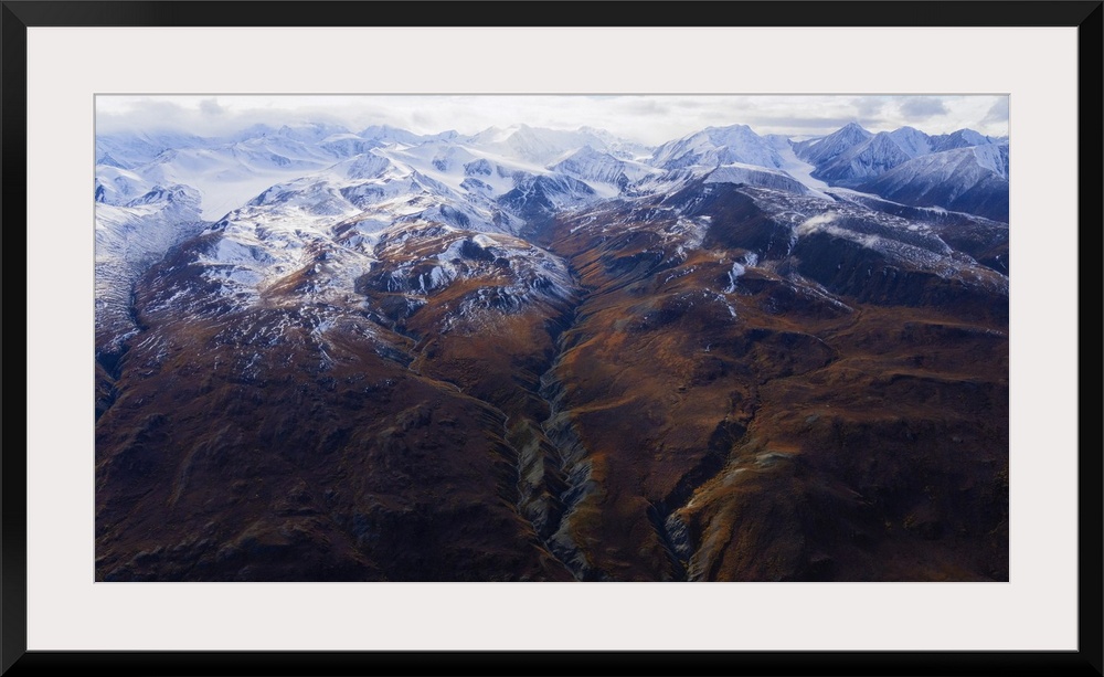 <p>Aerial photo of Kluane national park with fall colors and snow-capped peaks as autumn fades into winter creating a breathtaking image to fest upon; Haines junction, Yukon, Canada.</p>