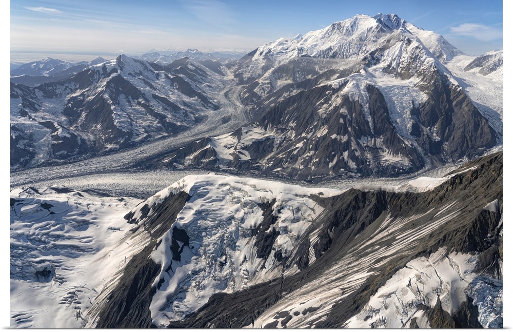 <p>Aerial photo of Kluane national park, with snow covered mountains and glacial masses making up the landscape, Haines junction, Yukon, Canada.</p>