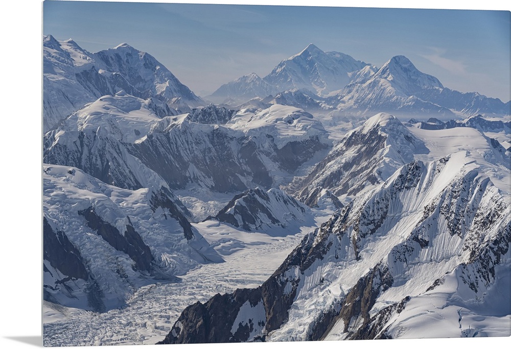 <p>Aerial photo of Kluane national park, with snow covered mountains making up the landscape, Haines junction, Yukon, Canada.</p>