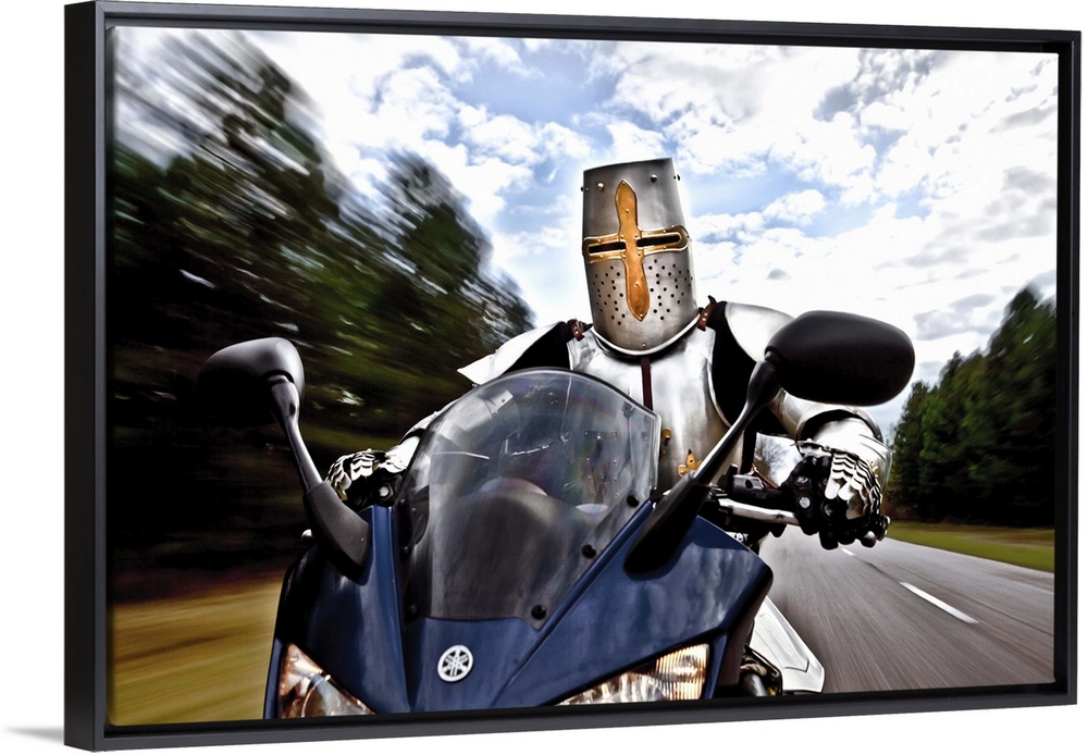 <p>Conceptual image of a knight wearing a suit of armor driving a motorcycle.</p>