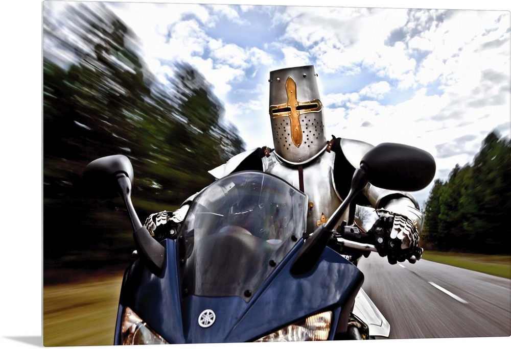 <p>Conceptual image of a knight wearing a suit of armor driving a motorcycle.</p>