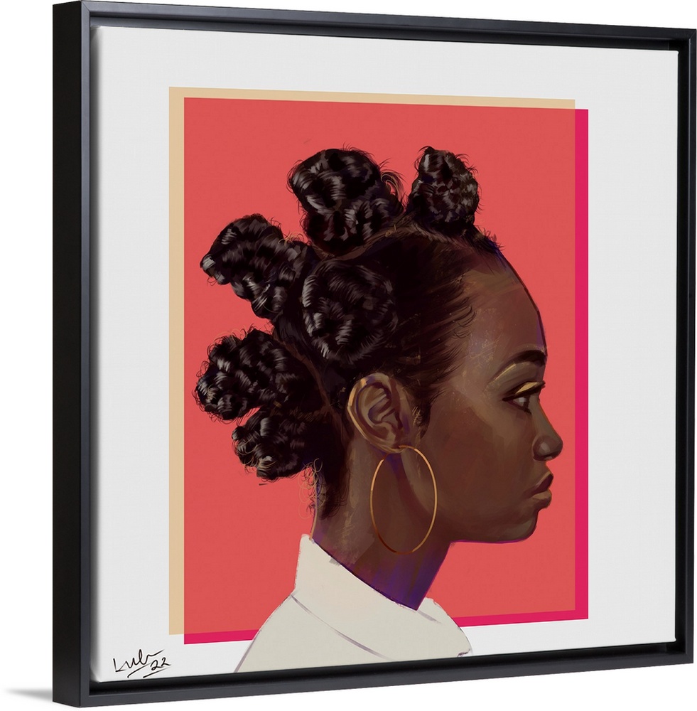 <p>A high impact contemporary portrait of a young Black woman with knotted hair and large gold hoop earrings</p>