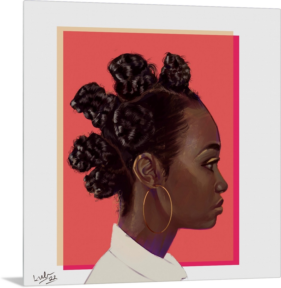 <p>A high impact contemporary portrait of a young Black woman with knotted hair and large gold hoop earrings</p>