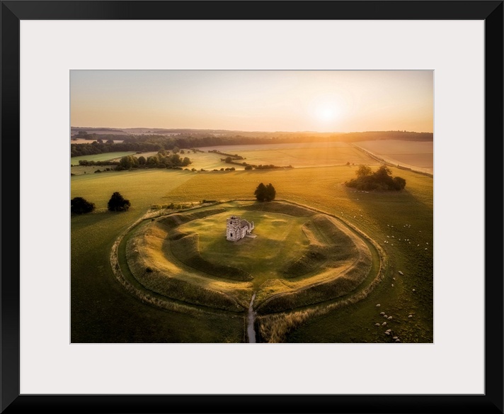 <p>Knowlton Church and earthworks from the air at sunrise, Knowlton, Dorset, England, UK</p>