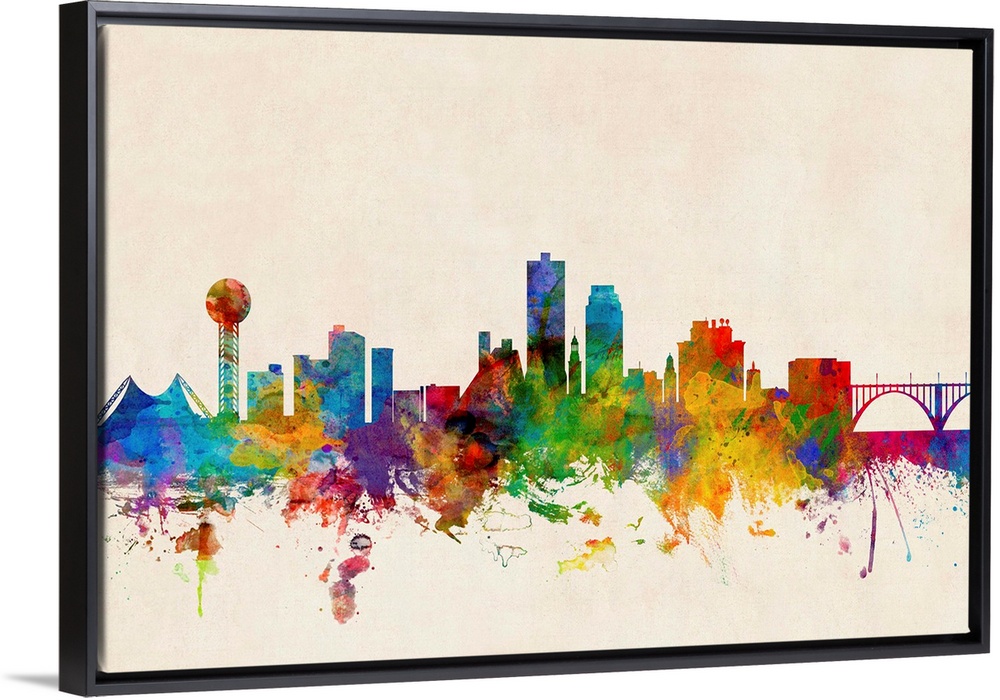 <p>A splattered and splashed watercolor silhouette of the Knoxville city skyline against a distressed background.</p>