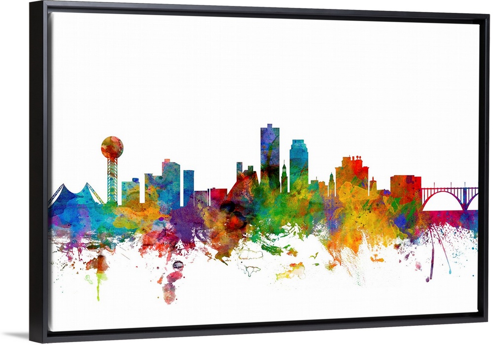 <p>Colorful watercolor splattered silhouetted of the Knoxville city skyline.</p>