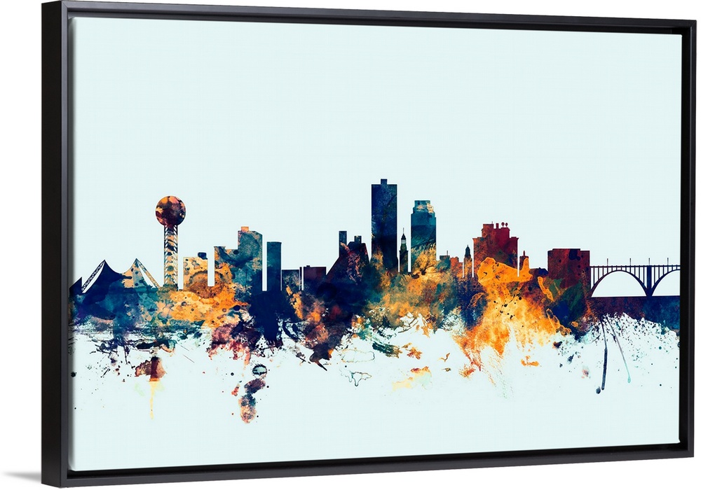 <p>Dark watercolor silhouette of the Knoxville city skyline against a light blue background.</p>