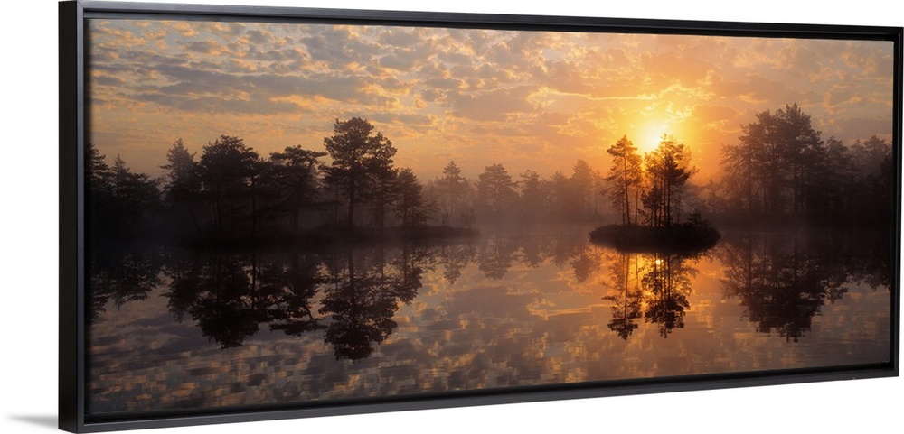 <p>Small islands stand in a large body of water with trees growing from them and the sunset just about to dip below the tops of the trees.</p>