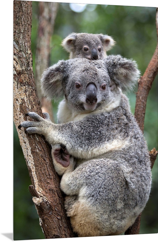 <p>Koala .Phascolarctos cinereus.Mother and eight-month-old joey.Queensland, Australia.*Captive.*Digitally removed twig on tree</p>