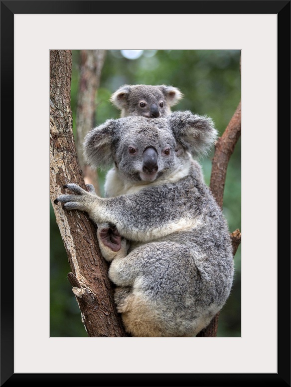 <p>Koala .Phascolarctos cinereus.Mother and eight-month-old joey.Queensland, Australia.*Captive.*Digitally removed twig on tree</p>