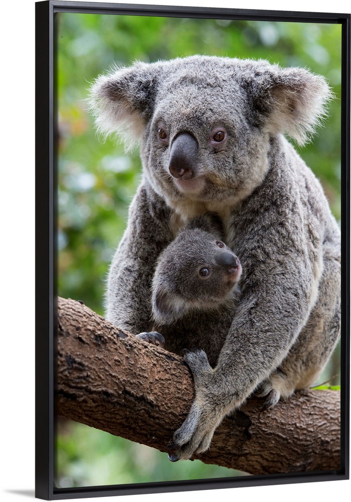 <p>Koala .Phascolarctos cinereus.Mother and eight-month-old joey.Queensland, Australia.*Captive</p>